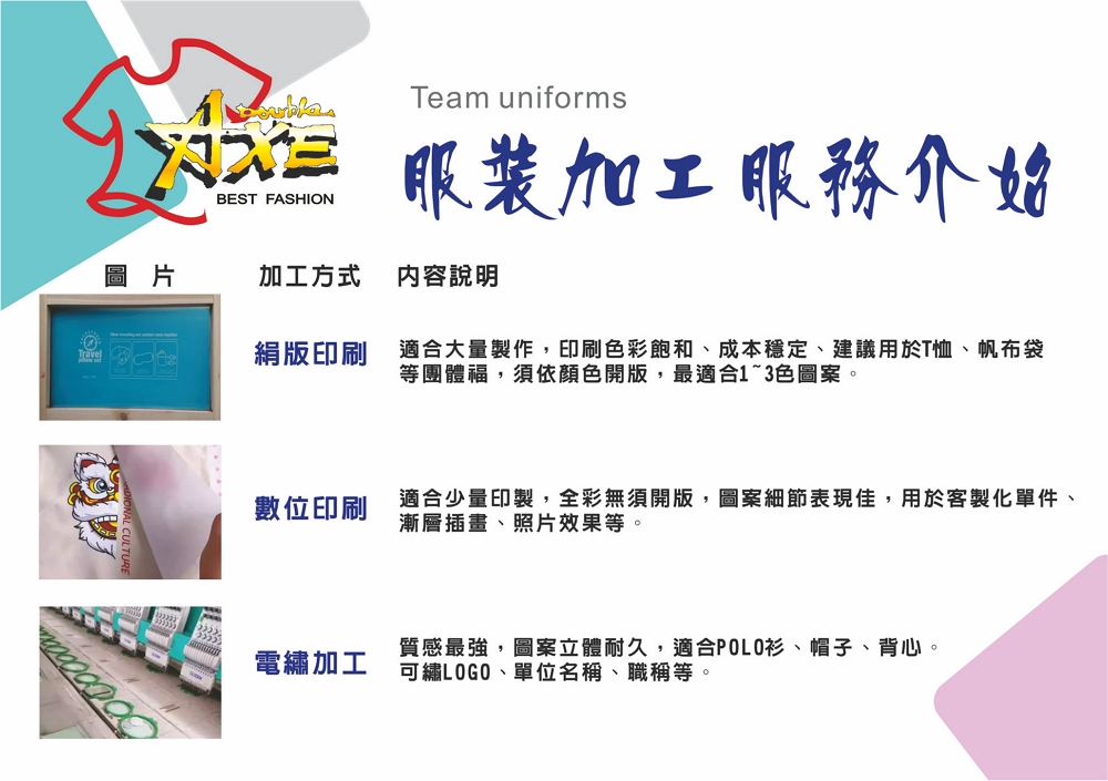 製作流程區 1. Logo設計/確認 提供LOGO或由我們協助設計 2. 版面設計/修改 衣服版型搭配排版位置建議 3. 開版/排版製作 依加工方式製作對應圖稿或版模 4. 試圖製作/樣品確認 提供模擬圖或樣品,確認後大量生產